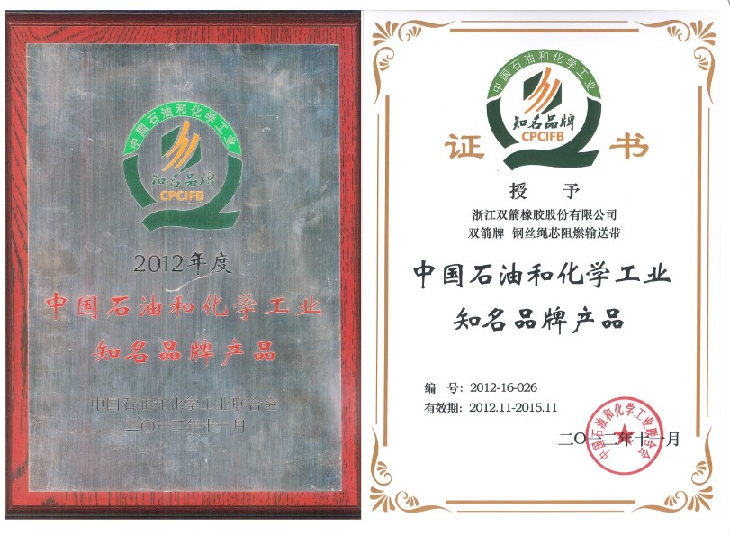 雙箭牌輸送帶被評為2012年度中國石油和化工行業(yè)知名品牌產(chǎn)品