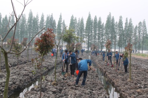 4月17日上午,在洲泉鎮(zhèn)眾安村一片剛剛翻土完畢的空地上,幾十名身穿藍(lán)色工作服的企業(yè)員工捋起袖子,揮動(dòng)鐵鍬,小心翼翼地栽種著一株株樹苗。這片占地32畝的片林又名“雙箭林”。